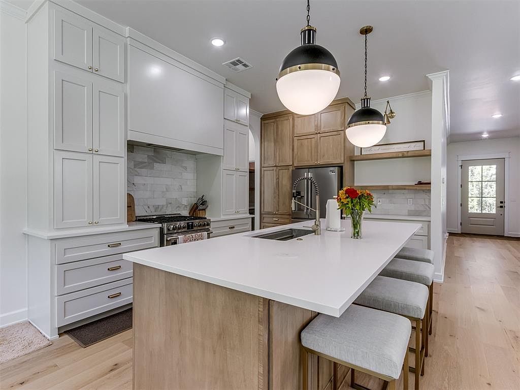 This bright kitchen features a large island with a white quartz countertop and light wood base, complemented by soft grey cushioned bar stools with gold metal legs. Above the island hang two oversized black and brass pendant lights, adding a modern industrial flair. The cabinetry contrasts with white maced storage units around the stove and natural wood tone tall cabinets near the refrigerator. The backsplash combines subtle gray and white marble tiles, blending seamlessly with the neutral color palette. Light hardwood floors and clean lines enhance the spacious and airy feel, while a vase of fresh flowers adds warmth and color.