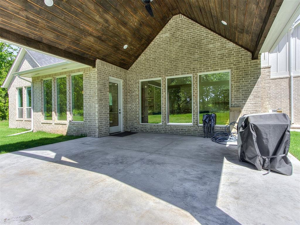 This outdoor patio space features a vaulted ceiling finished with dark stained wood planks, offering a warm, rustic contrast to the light gray brick exterior walls. Large floor-to-ceiling windows bring abundant natural light into the home while providing seamless views of the green lawn outside. A white door with glass panels provides direct access to the interior. The concrete floor is smooth and expansive, ideal for entertaining or relaxing outdoors. Modern recessed lighting and a ceiling fan enhance comfort and usability. A covered grill and folded chairs suggest a social space designed for outdoor dining and leisure.