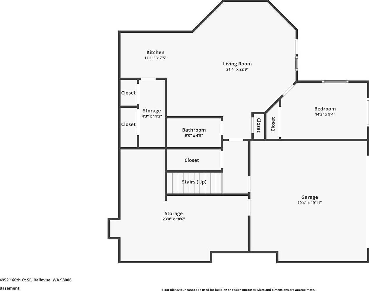 This basement layout features a well-organized design with a large living room measuring 21’4″ by 22’9″, positioned at the center. Adjacent to it is a compact kitchen area (11’11” by 7’5″), providing convenience for entertaining or daily use. Storage is abundant with two distinct spaces: a smaller one near the kitchen and a spacious 23’0″ by 18’6″ area at the bottom left, ideal for various needs. A bedroom with two closets sits next to the living room, complemented by a bathroom and multiple closets throughout. The garage occupies a significant portion on the right, easily accessible from the basement. Stairs connect this floor to the upper levels.