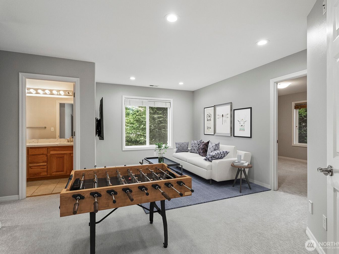 This recreation room presents a cozy and inviting atmosphere with soft gray walls and light carpeting. Positioned centrally, a foosball table adds a playful touch, encouraging social interaction and fun. Along one wall, a white modern sofa with patterned pillows rests on a textured navy-blue rug, creating a comfortable seating area complemented by a small round wooden side table. Above the couch, three art pieces offer a simple yet stylish focal point. Natural light streams in through a large window, balancing the recessed ceiling lights and enhancing the room’s light, airy feel. Doorways lead to adjacent rooms, adding flow and accessibility.