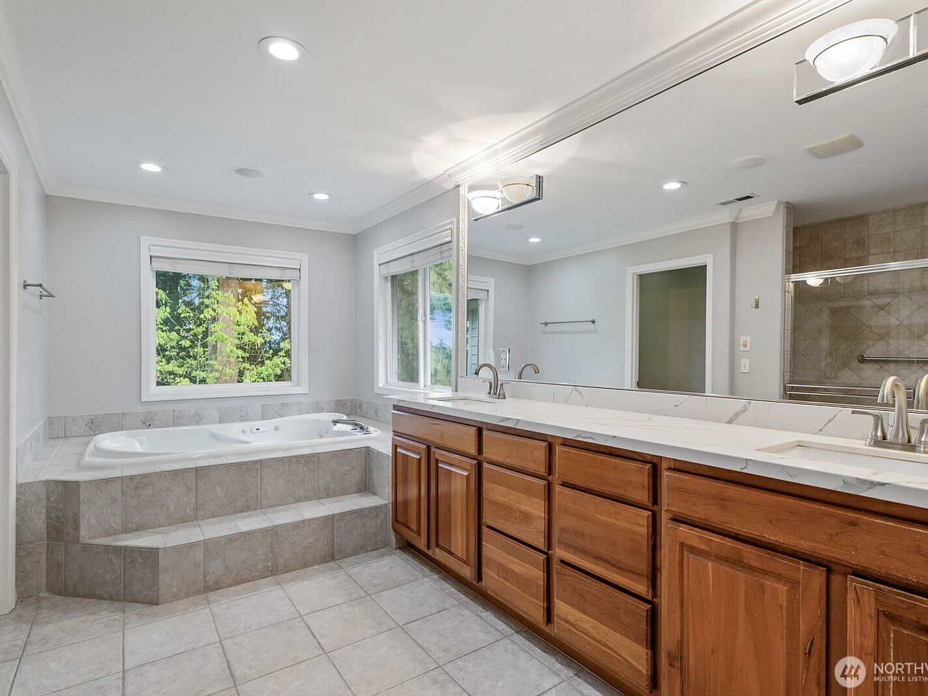 This spacious bathroom features a built-in soaking tub elevated on tiled steps, positioned under two large windows allowing abundant natural light and views of green foliage outside. The room’s color scheme blends soft light gray walls with neutral, beige tile flooring and tub surround. A long wooden vanity with rich, natural wood cabinetry contrasts elegantly against the white marble countertop that spans the length of the wall. Above the vanity, a large mirror with dual modern light fixtures enhances the brightness and feeling of openness, emphasizing clean lines and a tranquil, natural palette.