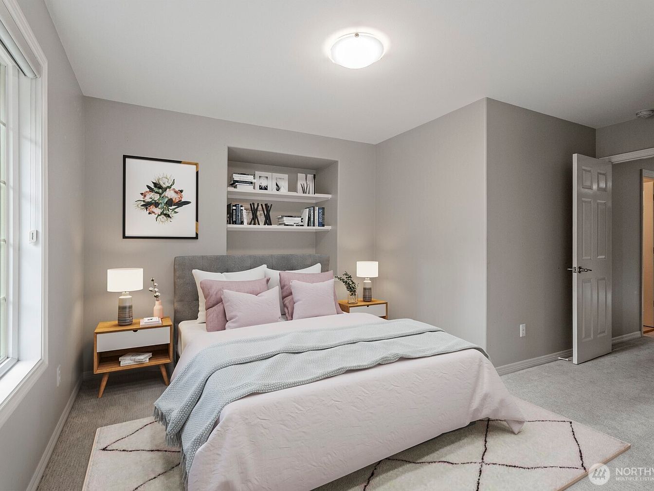 This master bedroom features a tranquil neutral color palette with soft gray walls and carpeting that create a calm ambiance. The bed is centered against a recessed wall niche, which houses two white floating shelves displaying monochrome framed art and books, adding subtle character. The bed is dressed in light bedding layered with soft lavender and blush pink pillows, paired with a pale blue knitted throw for a hint of color. Each side of the bed has a mid-century modern wooden nightstand topped with minimalist table lamps, balancing function and style. Natural light filters in through a large window, brightening the space and enhancing the cozy atmosphere. A geometric patterned rug anchors the bed visually, emphasizing the room’s clean and modern aesthetic.