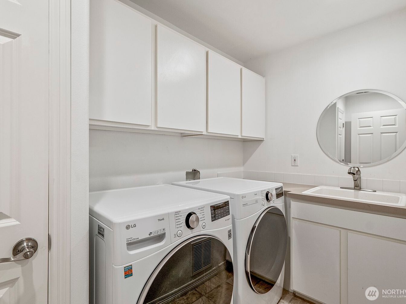 This laundry room features a clean and modern design with a predominantly white color scheme. Against the wall sit a sleek front-loading washer and dryer set by LG, designed for efficiency and style. Above them, simple white cabinetry provides ample storage, seamlessly blending with the surrounding walls to maintain an uncluttered look. To the right, a built-in white sink with a modern faucet is integrated into a countertop that extends slightly over additional cabinetry below, offering practical workspace. A round mirror above the sink adds a touch of softness and functionality, reflecting the brightness of the room. The space prioritizes utility while maintaining a fresh, minimalistic aesthetic.