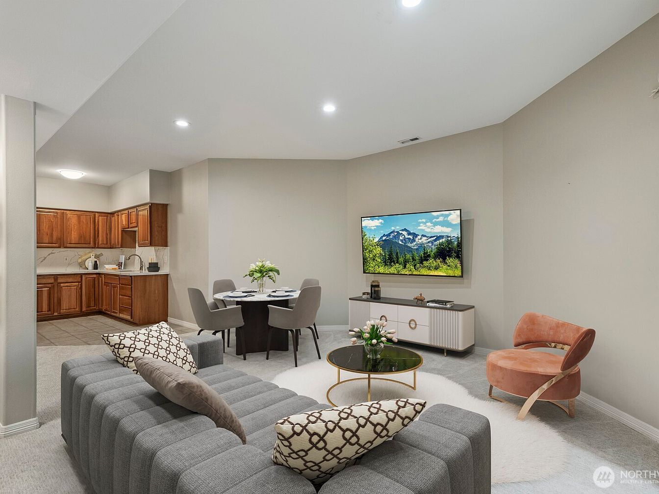 This open-concept living space combines comfort with functional design. The area features a modern gray tufted sofa adorned with patterned and solid cushions, positioned to face a sleek wall-mounted flat-screen TV that displays a scenic mountain view. A round glass coffee table with gold metal legs sits centrally on a plush white rug, enhancing the cozy ambiance. To the side, a soft, peachy-pink armchair adds a subtle pop of color against the neutral beige walls and carpeted flooring. The dining nook includes a small round table surrounded by four contemporary gray upholstered chairs, harmonizing with the seating in the living area. The adjacent kitchen is lined with warm wooden cabinetry, light countertops, and a marble-effect backsplash, providing a tasteful contrast and practical workspace. Recessed ceiling lights brighten the space, highlighting the smooth, minimalist décor and open flow from the kitchen to living and dining zones.