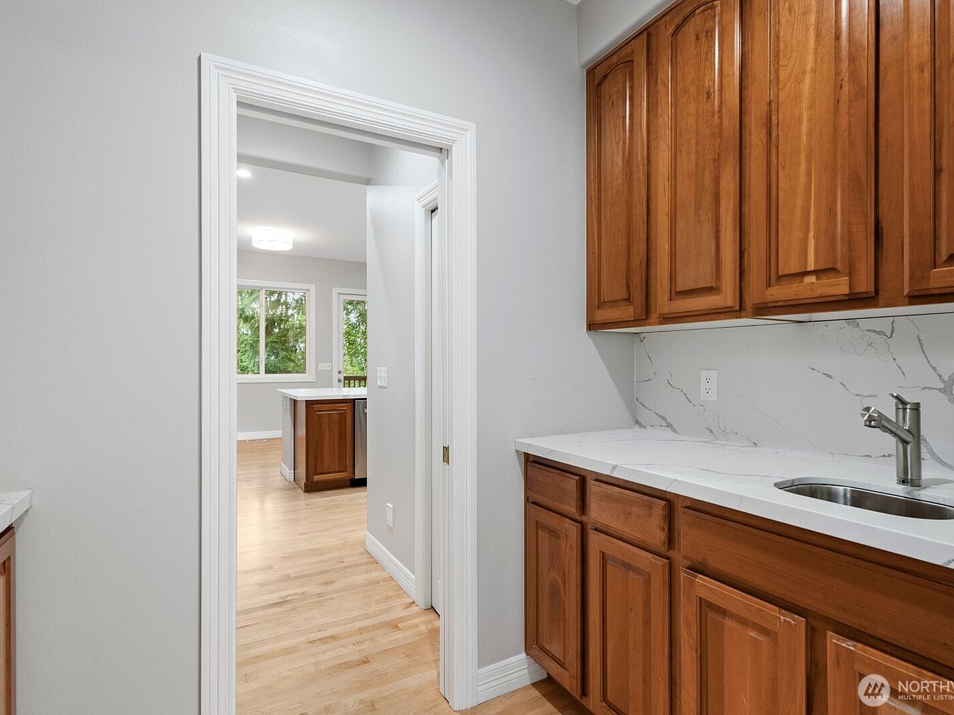 This transitional butler’s pantry creates an inviting transition between the kitchen and additional living space. It features rich, warm wood cabinetry with raised panel doors, adding a traditional touch. The countertops and backsplash are crafted from a sleek white marble-like material with subtle gray veining, complementing the cabinetry while brightening the space. The built-in stainless steel sink and faucet add modern convenience. The light wood flooring flows seamlessly into the adjacent kitchen, visible through a wide doorway framed with simple white trim. Natural light filters in from the large kitchen windows, creating an airy, cohesive look.