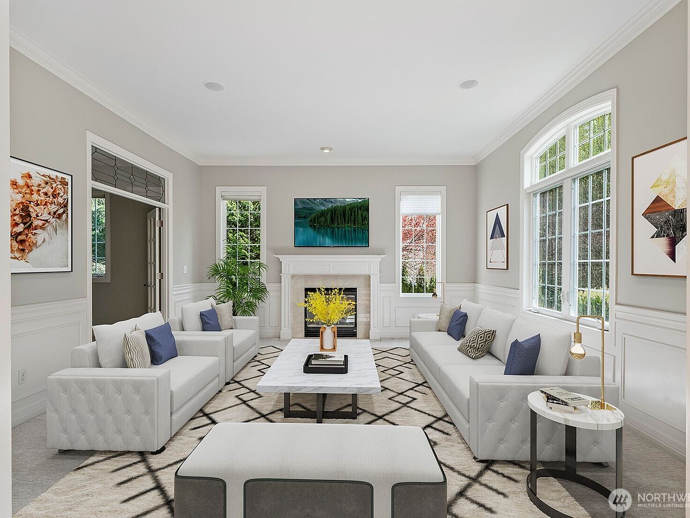 This elegant family room features a balanced layout centered around a fireplace flanked by two tall, narrow windows. The neutral color scheme revolves around soft gray walls paired with white trim and wainscoting, creating a bright and airy atmosphere. Two large sofas and two matching armchairs face each other over a modern marble coffee table set on a geometric-patterned rug. Plush cushions in muted blues and beige add subtle pops of color. Large windows on one side provide ample natural light, complemented by tasteful framed artwork on the walls and a touch of greenery near the fireplace, adding warmth and freshness to the sophisticated space.