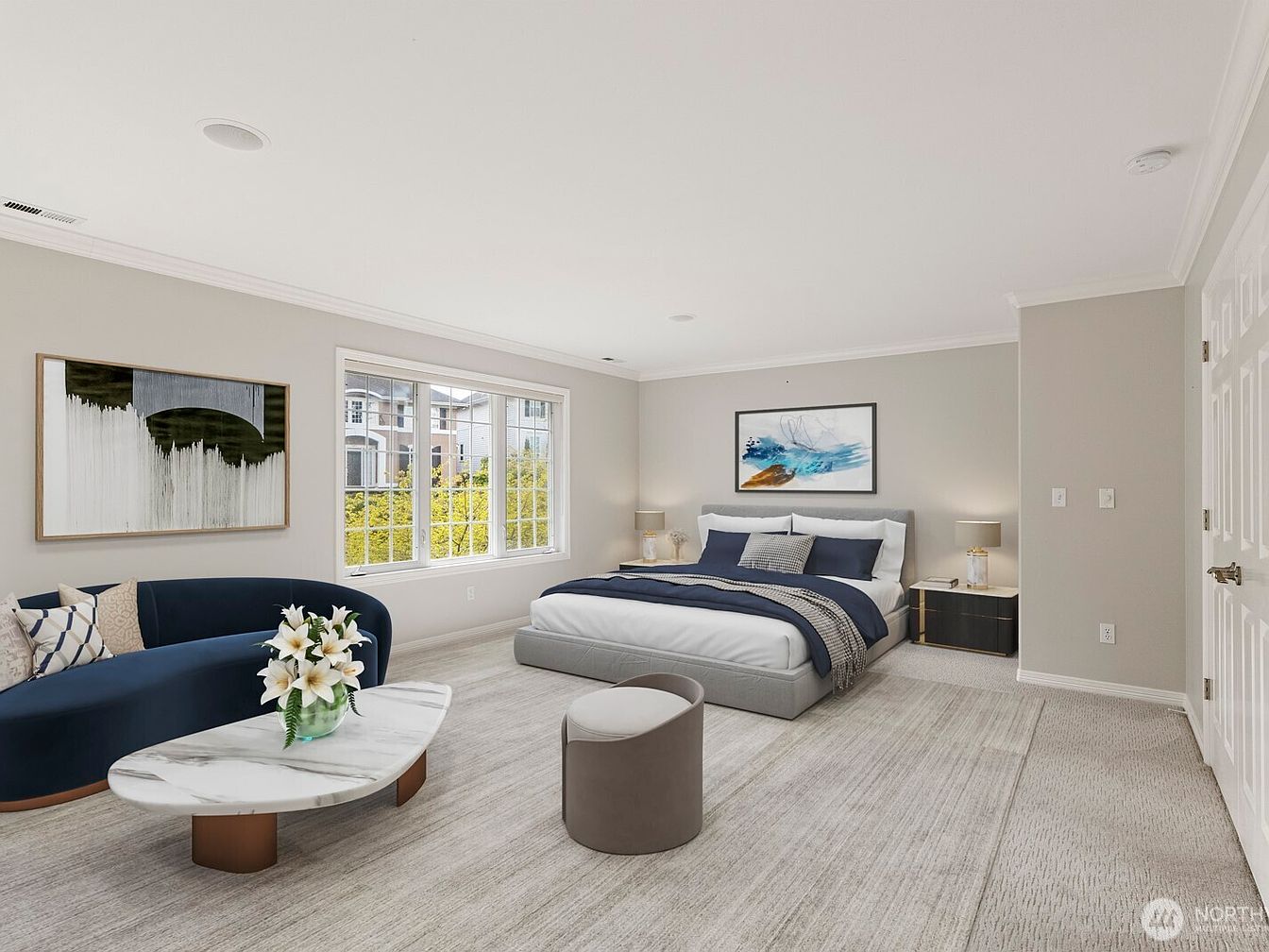 This spacious master bedroom features a calming neutral palette with soft beige walls and light gray carpet flooring that enhances the room’s airy feel. A large window fills the space with natural light, complementing the contemporary decor. The centerpiece is a plush bed with crisp white linens and navy blue accents, flanked by sleek nightstands with modern lamps. An inviting curved navy sofa pairs elegantly with a white marble coffee table adorned with fresh lilies, while a small upholstered round ottoman provides additional seating. Abstract artwork above the bed and sofa adds a splash of color and visual interest to this sophisticated retreat.