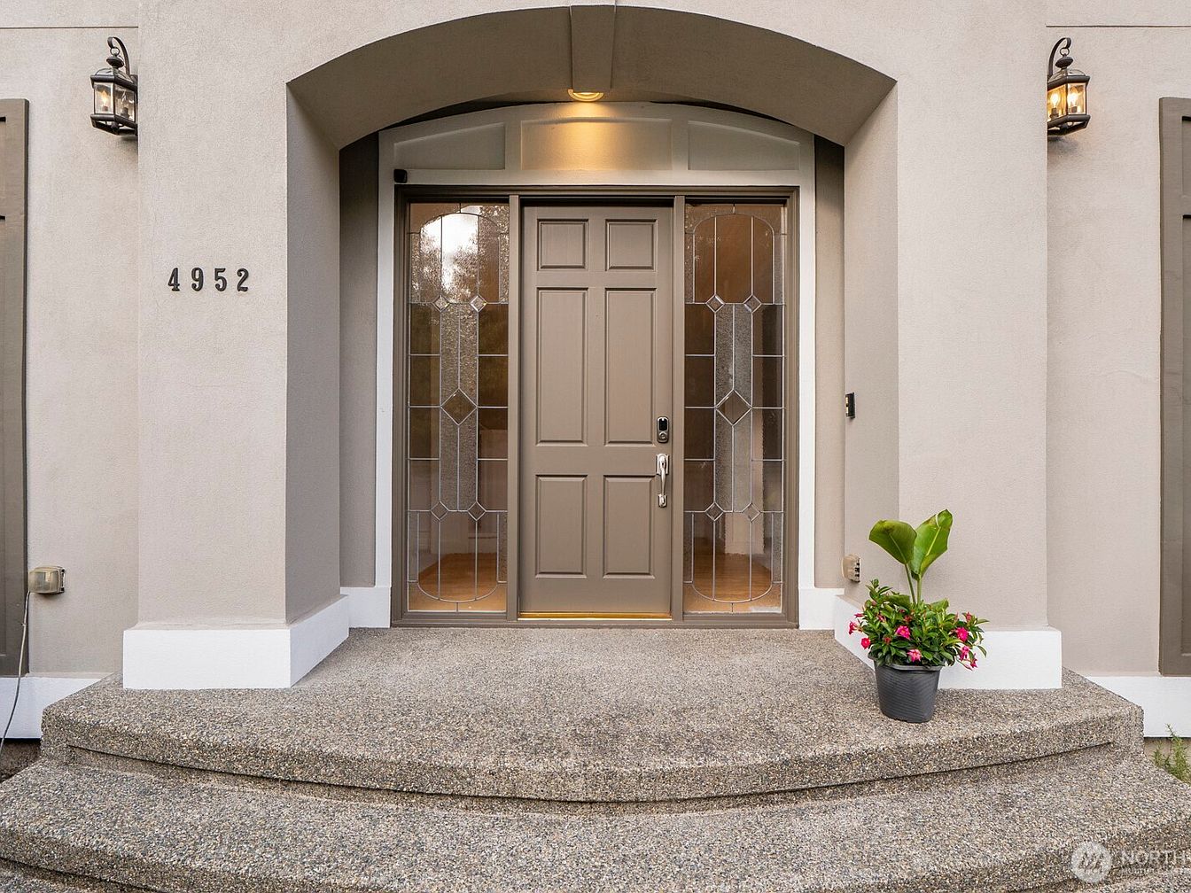 The front entryway presents a clean, inviting approach with a subtle arch overhead enhancing the modern architectural appeal. The main door, painted in a muted taupe, complements the soft, neutral-toned exterior walls. Flanking the door are tall, narrow glass sidelights featuring an intricate geometric leaded design that adds elegance and light to the foyer. Symmetrically placed black lantern-style wall sconces provide ambient lighting. A small potted plant with vibrant pink flowers adds a touch of nature and color against the smooth gray exposed aggregate steps. The overall style suggests a blend of contemporary and classic design elements, welcoming visitors warmly.