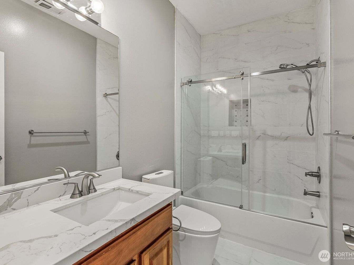 This bathroom combines functionality with elegant design. It has a white marble countertop with subtle gray veining atop warm wooden cabinetry, providing a balance of natural warmth and modern sleekness. The large mirror above the sink enhances the sense of space and reflects the neutral-toned walls, contributing to a calm atmosphere. A glass sliding door encloses the bathtub and shower area, where walls are adorned with large, white marble tiles featuring delicate gray patterns. Brushed metal fixtures including a curved faucet, towel bars, and showerhead add a sophisticated, contemporary touch to the overall design.
