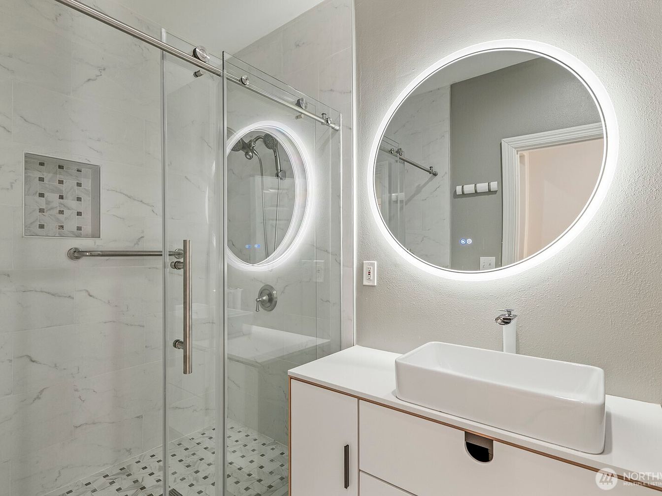 This sleek bathroom focuses on a minimalist design with a floating white vanity topped by a rectangular vessel sink, complemented by a modern single-handle faucet. The centerpiece is a large circular mirror with integrated LED lighting that casts a soft glow, enhancing the clean, neutral tones of the space. The shower features frameless sliding glass doors with brushed metal hardware, while marble-effect tiles with subtle grey veining line the walls. The shower floor has a patterned tile with a built-in niche for toiletries, blending functionality with contemporary elegance and simplicity throughout.