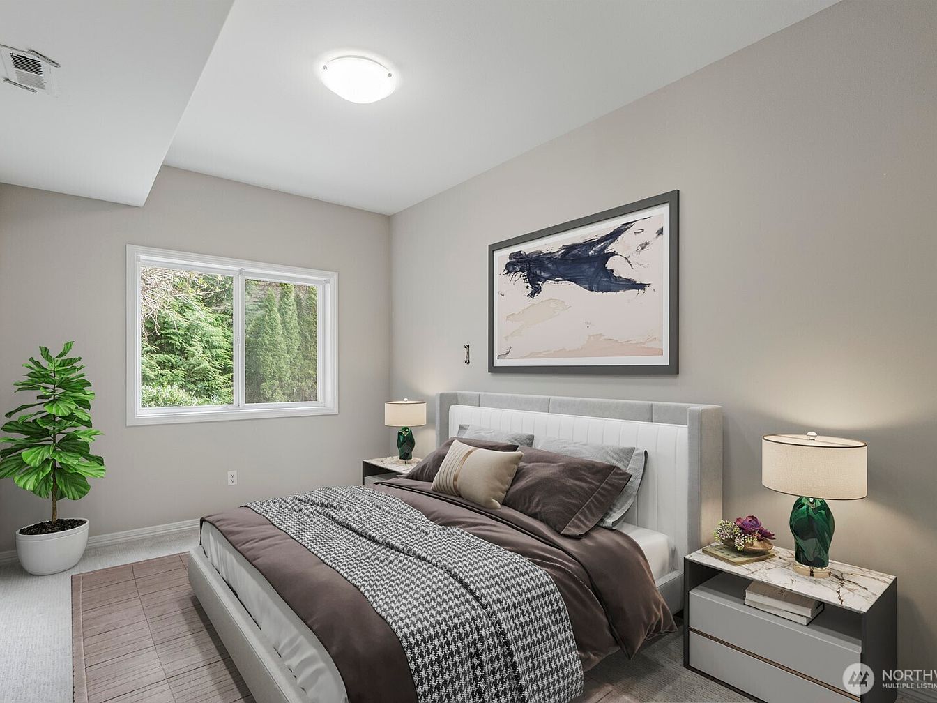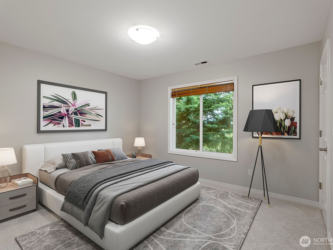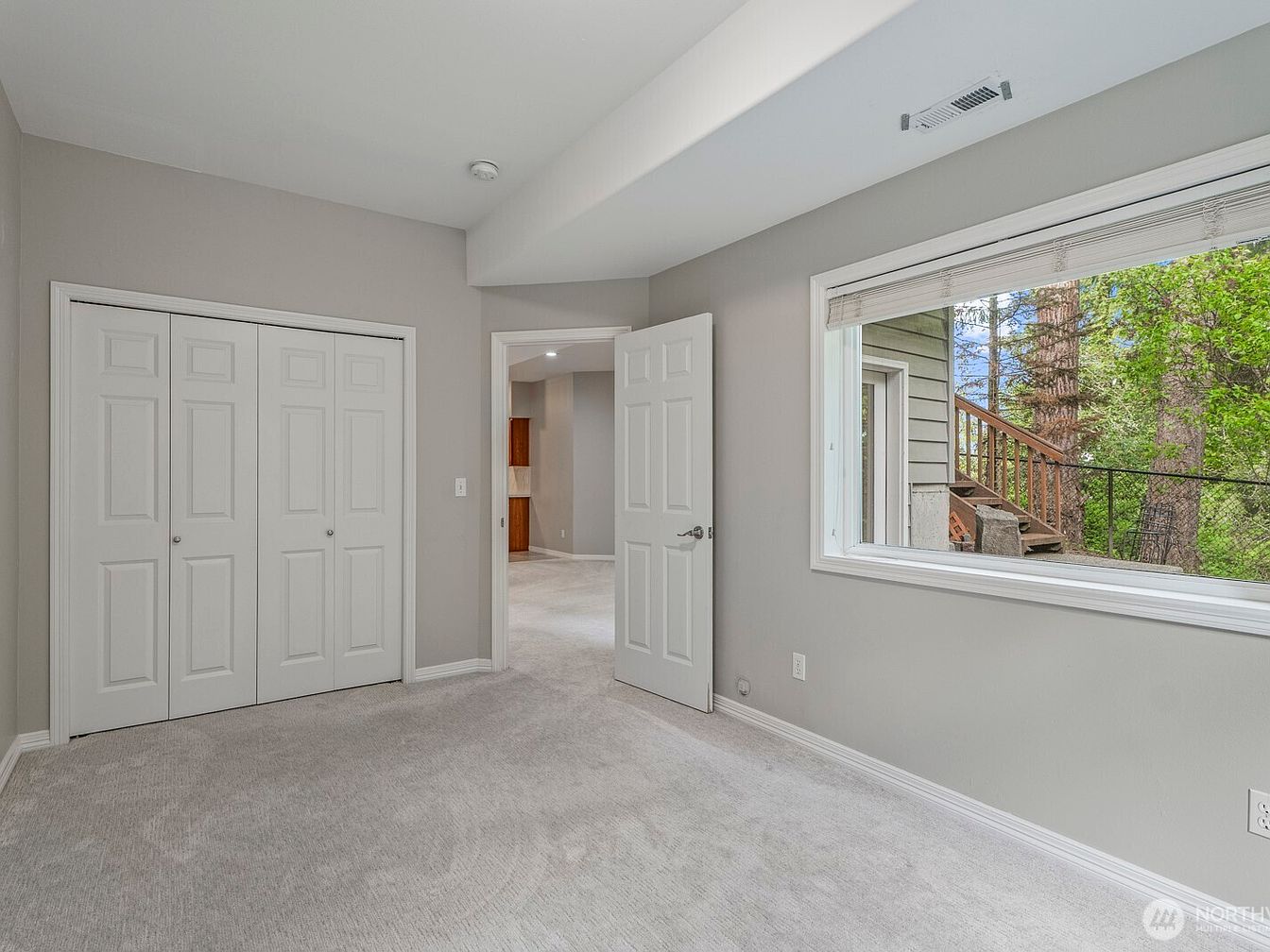 This serene bedroom features soft gray walls that complement the plush, light-colored carpeting, creating a calming and inviting space. A large window offers an expansive view of lush greenery and wooden stairs outside, allowing abundant natural light to brighten the room. The white trim around the window and doors adds a crisp contrast, highlighting clean architectural lines. The double-door closet provides ample storage with paneled doors matching the entry door, which opens to a softly lit hallway, emphasizing the room’s cozy yet open atmosphere perfect for relaxation and peaceful mornings.