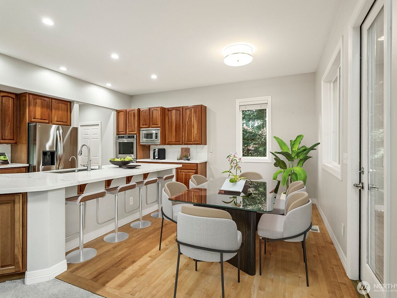 This open-plan kitchen and dining space features warm wooden cabinetry paired with sleek white countertops that create a balanced contrast. A large island with a polished surface extends into a breakfast bar with four minimalist stools, offering a casual seating area. Across from the island, a rectangular glass-top dining table sits surrounded by eight cushioned chairs with modern upholstery in soft taupe tones. Natural light filters through a window and glass door, brightening the space while a lush green plant adds a touch of nature. The clean lines, neutral palette, and wood flooring bring a contemporary yet inviting atmosphere to this communal hub.