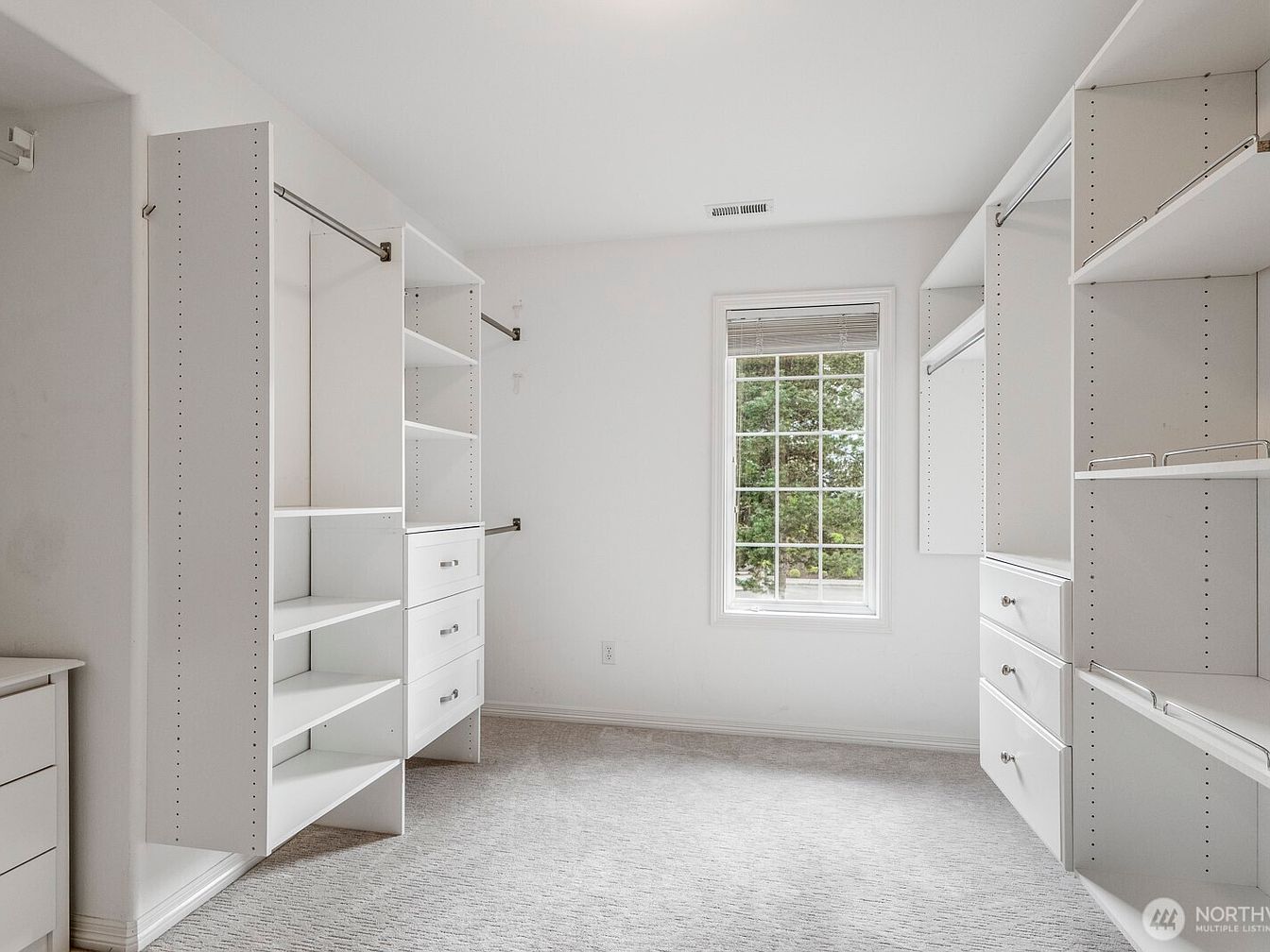 This spacious walk-in closet offers an organized and airy storage solution with a clean, minimalist design. White built-in shelving units and drawers line both sides of the room, providing ample space for folded clothes and accessories. Multiple hanging rods are strategically placed for easy access to hanging garments. Soft, neutral carpeting adds warmth and comfort underfoot, complementing the bright white walls and cabinetry. A large window at the far end lets in natural light, creating a bright and inviting atmosphere while showcasing a view of greenery outside, enhancing the refreshing and uncluttered aesthetic.