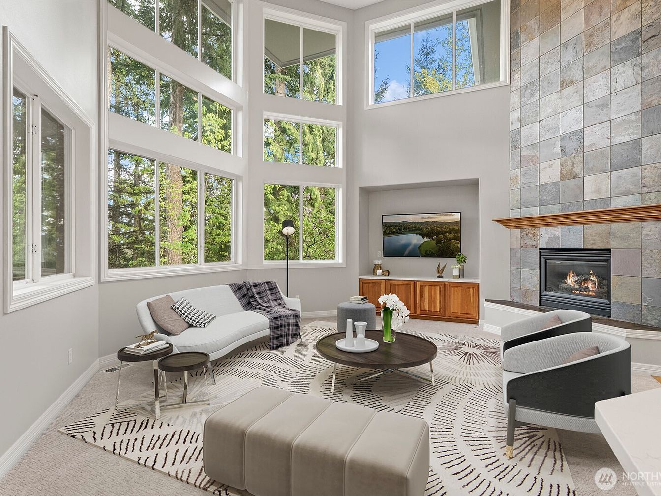 This living room features a striking double-height ceiling with expansive floor-to-ceiling windows that flood the space with natural light and provide serene views of lush, green trees. The color palette is soft and neutral, dominated by light grays and whites, creating a calm and airy ambiance. A modern curved sofa, two stylish armchairs, and a sleek ottoman are arranged around a large, patterned area rug that adds texture and visual interest. The focal point is a tall tiled fireplace with a wooden mantel, complemented by built-in wooden cabinetry under a wall-mounted flat-screen TV, blending modern design with cozy warmth.