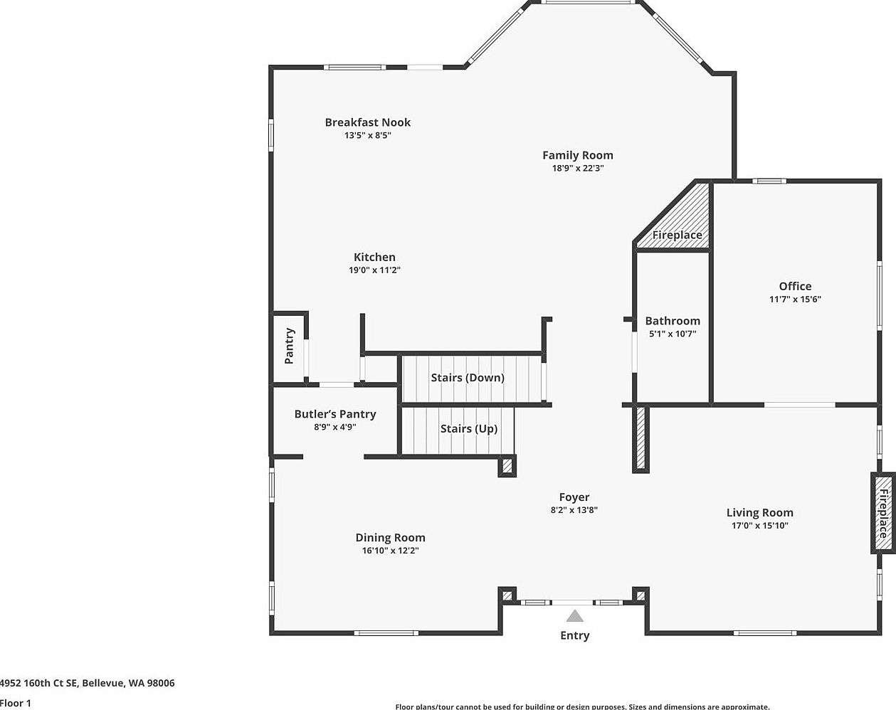This first-floor plan reveals a spacious and thoughtful layout designed for comfortable living and entertaining. The entryway opens to a welcoming foyer, centrally positioned with stairs leading both up and down. On the right side, a large living room with a fireplace offers a cozy space, adjacent to an office and a small bathroom. The left side of the home features a formal dining room connecting to a sizable kitchen complete with a pantry and a dedicated butler’s pantry. The kitchen flows into a breakfast nook and a generously sized family room, also with a fireplace, making it perfect for gatherings. The design prioritizes natural light with multiple windows and an open flow among main living areas.