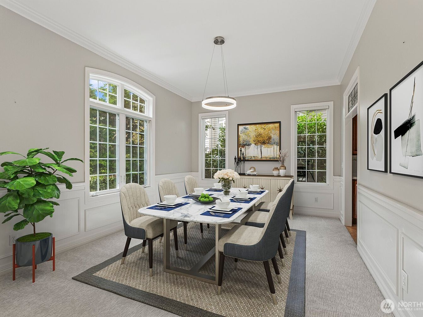 This elegant dining room features a rectangular marble-top table seating eight, offering a contemporary yet cozy setting. The chairs have a two-tone design with light beige upholstery in front and muted blue fabric on the back, resting on dark wooden legs with light tips. Neutral tones dominate the walls and carpet, blending soft gray and beige hues with crisp white wainscoting and trim. Large, tall windows flood the space with natural light and provide views of greenery outside. Accent elements include a modern circular pendant light, abstract art on one wall, and a cabinet with tasteful decor beneath a framed tree painting. A lush green potted plant adds freshness to the corner, completing the harmonious, sophisticated look.