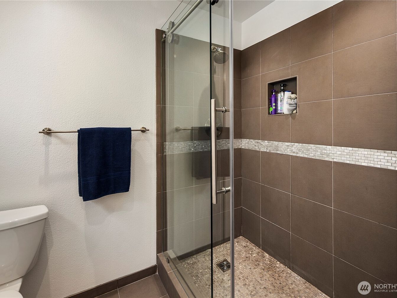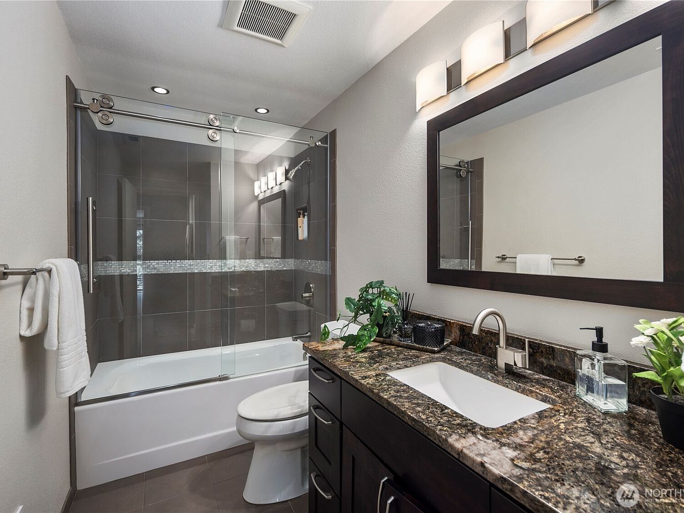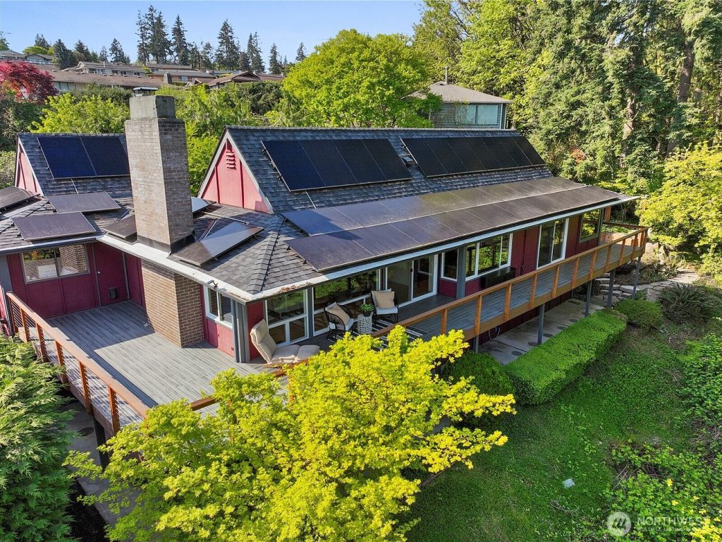This elegant home in Bellevue, WA, showcases a modern architectural style with clean lines and a prominent use of solar panel technology for energy efficiency. Built with an emphasis on panoramic water views, the house overlooks Lake Sammamish, visible from almost every room on the main level. The expansive back deck provides an ideal setting for relaxation or entertaining, offering a full-width private perch above the serene lake. The interior features a light-filled living room, an updated kitchen, and a primary suite designed for comfort and tranquility. Recent renovations appear to include high-end spa-like bathrooms with heated floors and a large master shower, enhancing the property’s luxury feel. Energy-saving upgrades include a fully owned solar panel system and a high-efficiency heat pump, ensuring year-round comfort in an eco-friendly manner. Additional amenities such as an automated sprinkler system and a security system add convenience and peace of mind. Priced at $2,200,000, this home is situated in a top-rated school district in Bellevue, making it ideal for families.