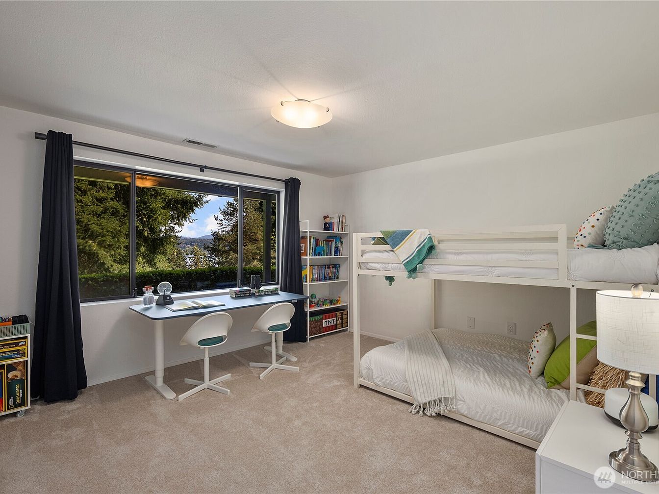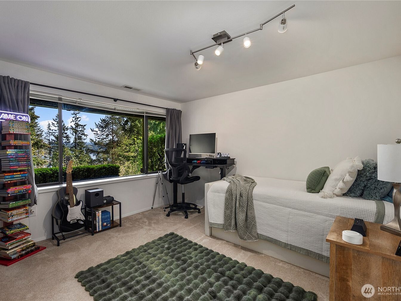 This bedroom corner offers a tranquil retreat with a large picture window framing lush greenery and distant water views, inviting ample natural light. The neutral walls and beige carpet provide a calming backdrop, accentuated by a textured, deep green area rug that adds warmth and depth. A single bed dressed in light linens is complemented by plush pillows and a soft green throw. A small workspace with a modern desk and ergonomic chair sits by the window, pairing functionality with scenic inspiration. Personal touches like a collection of books, a guitar, and a “Game On” neon sign create a relaxed, personalized ambiance.