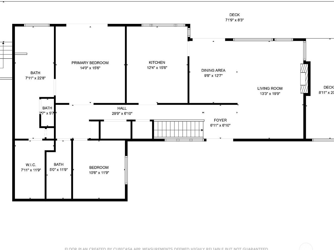 This detailed floor plan highlights a well-organized home layout with a spacious primary bedroom measuring 14’0″ by 15’6″ and an adjacent large bath. The kitchen is centrally located, sized at 12’4″ by 15’6″, offering direct access to the dining area and expansive living room, which extends to two decks for outdoor enjoyment. The home also features a secondary bedroom, additional bathrooms, and a walk-in closet, all connected by a long hallway. The foyer and stair placement offer a clear entrance flow, emphasizing functionality and comfort throughout the residence.