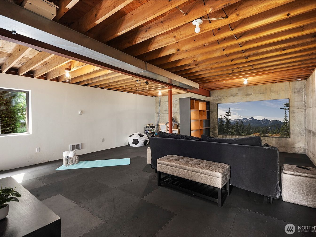 This basement combines entertainment and fitness in a spacious, functional layout. Exposed wooden beams highlight the ceiling, lending a warm, rustic touch against the industrial concrete walls. A large wall-mounted screen faces a deep black sectional sofa, creating a cozy media zone with accompanying ottomans and a plush bench enhancing seating options. Adjacent to this setup is an open floor exercise area outfitted with black interlocking mats, a yoga mat, and props, offering a dedicated workout space. Natural light filters in through a single window, softening the otherwise utilitarian atmosphere with balanced indoor-outdoor harmony.