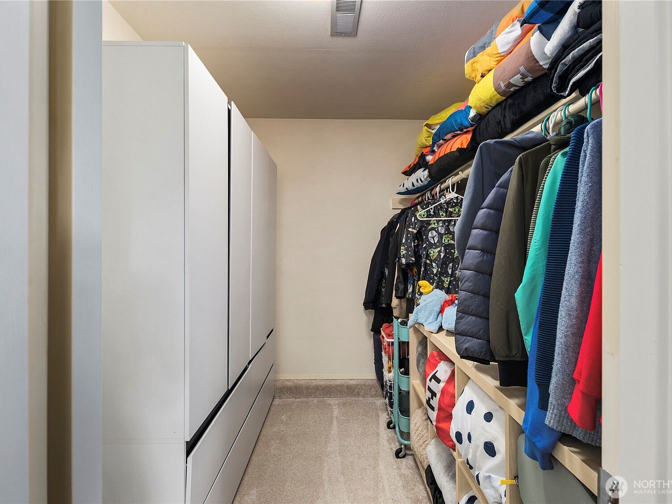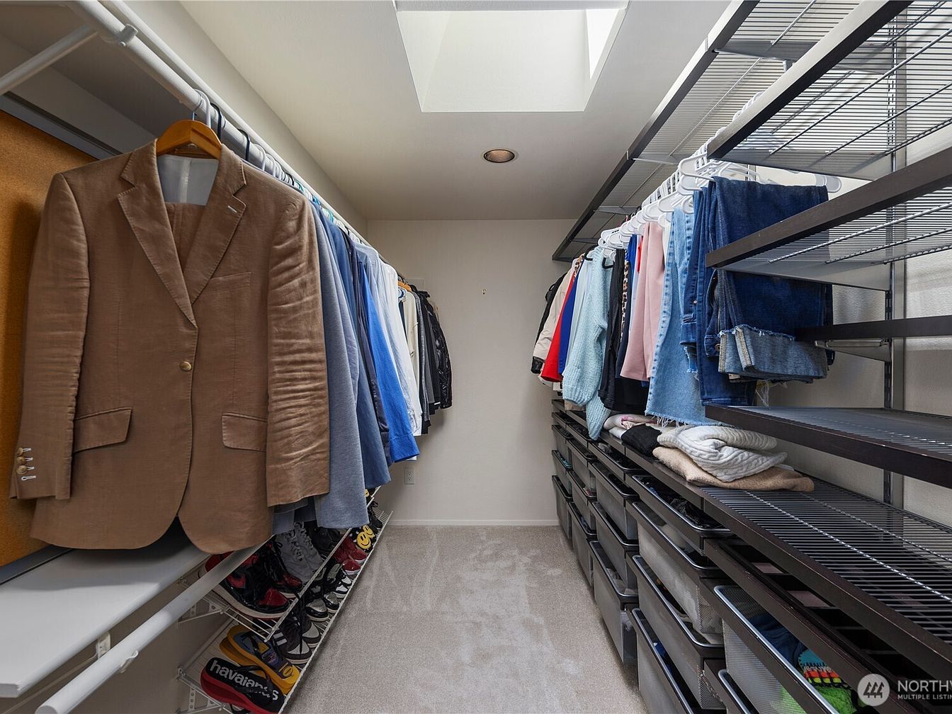 This spacious walk-in closet features a clean and functional layout with clothing racks on both sides, maximizing storage capacity. One side is dedicated to hanging jackets, shirts, and coats, arranged by color and style, while the opposite side offers shelves and multiple pull-out drawers beneath a rack of hanging pants and sweaters. The closet is finished with a neutral palette, primarily white walls, and light beige carpet flooring that adds a sense of warmth. A skylight overhead brings natural light into the space, enhancing visibility and contributing to an airy, organized atmosphere perfect for wardrobe management.