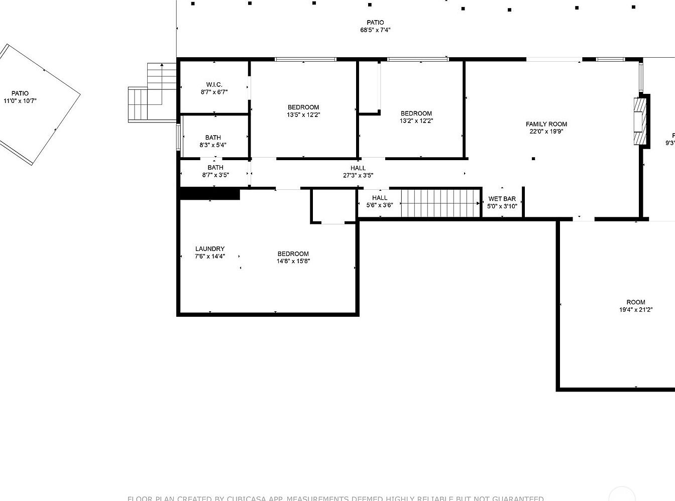 This floor plan reveals a thoughtfully designed lower level featuring multiple bedrooms for versatile living. The layout includes three bedrooms adjacent to a hall, showcasing two bathrooms for convenience. A generous family room anchors the space, complete with a fireplace, creating a cozy yet expansive living area measuring 22 by 19 feet. A wet bar nearby is perfect for entertaining. Additional functional spaces include a laundry room and a large multipurpose room. There are two patios accessible for outdoor enjoyment, highlighting a balance between comfort, utility, and recreation in this lower level design.