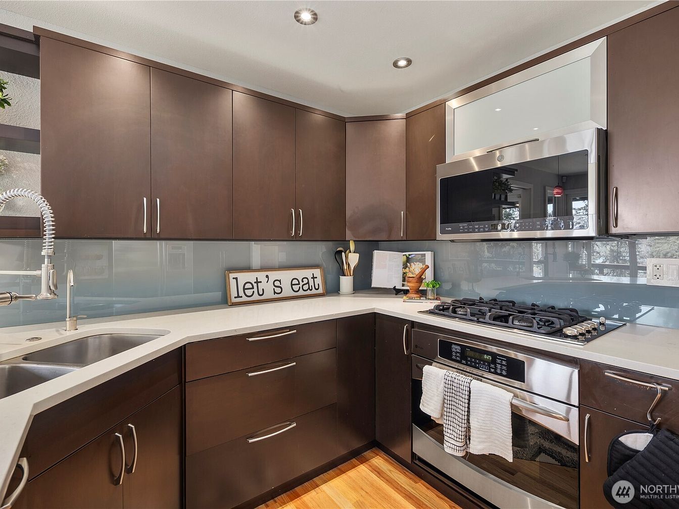This kitchen corner features a sleek, contemporary design with dark brown cabinetry that extends seamlessly around the corner. The cabinetry is accented by stainless steel handles that enhance its modern appeal. A white quartz countertop contrasts beautifully against the darker wood tones while providing ample workspace. The backsplash consists of a smooth, glossy light blue-grey glass panel that reflects light and adds depth. Stainless steel appliances, including a built-in microwave and a gas stove with an oven below, bring a refined, professional touch to the space. The under-cabinet lighting and recessed ceiling lights ensure a bright, functional cooking area. Warm wooden flooring completes this inviting, stylish ensemble.