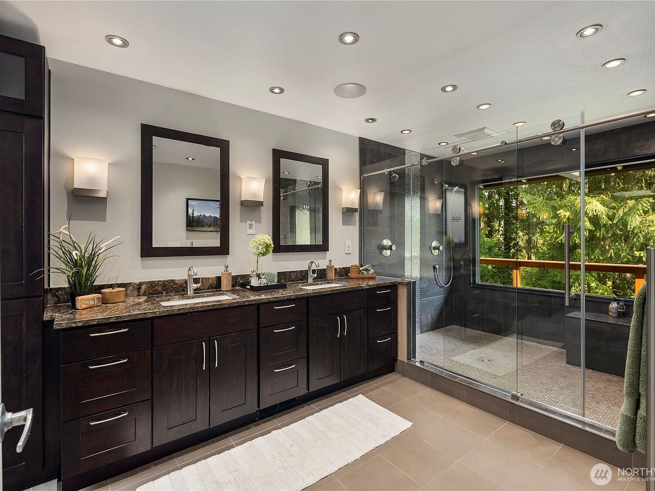 The space features a modern, elegant bathroom with a dual vanity setup in dark wood cabinetry topped with rich, marbled countertops. Two rectangular mirrors with dark frames are mounted above the sinks, flanked by soft, wall-mounted light sconces that add ambient lighting. The floor is covered with large, neutral beige tiles complemented by a white textured bath mat. Adjacent to the vanity is a spacious glass-enclosed shower with dark tile walls, multiple showerheads, and a built-in bench. A large window brings in natural light and offers a tranquil view of lush greenery, enhancing the serene atmosphere.