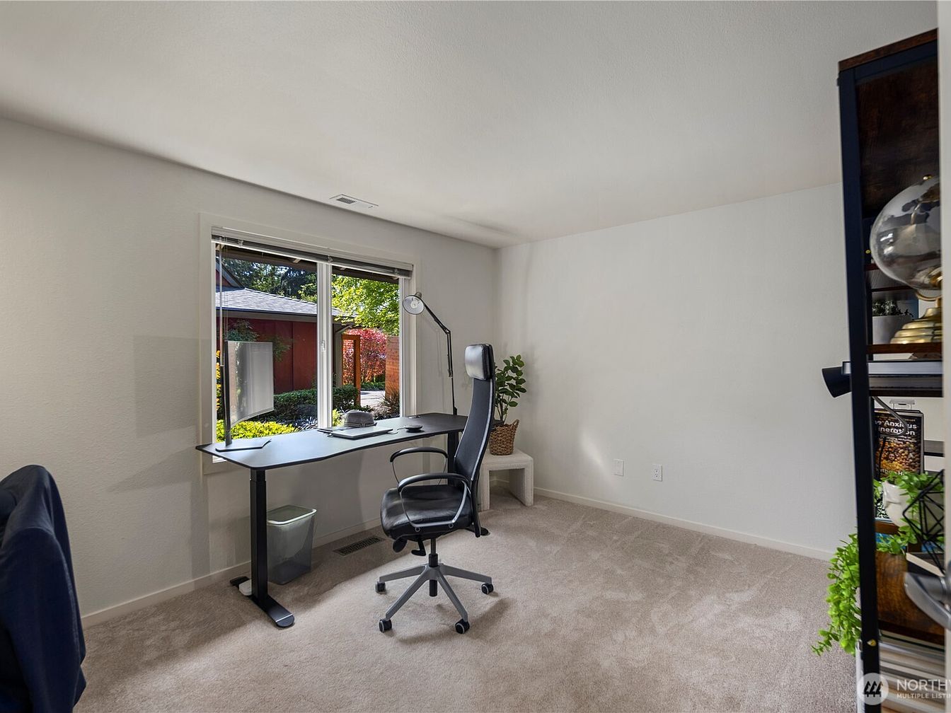 This serene home office is bathed in natural light from a large window facing the garden, offering a calming view. The room features a sleek, black, height-adjustable desk paired with a modern ergonomic black office chair for comfort and productivity. A floor lamp adjacent to the desk adds focused lighting for work hours. The neutral beige carpet and soft white walls create an airy, minimalist backdrop. Subtle touches of greenery, including a potted plant and decor on a partially visible shelving unit, introduce natural elements that enhance the tranquil ambiance.