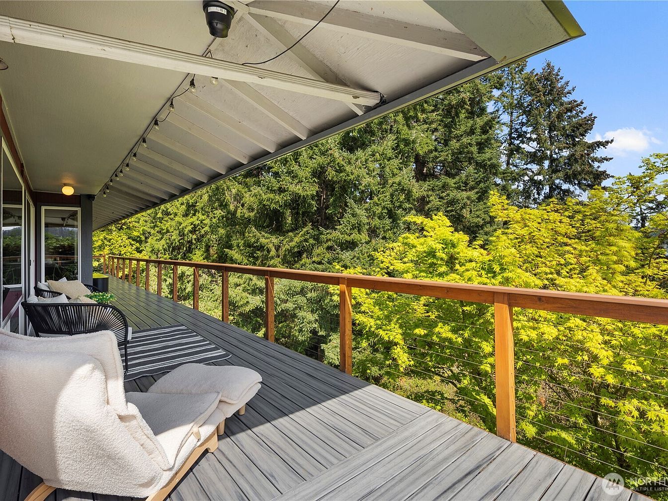 This spacious covered balcony extends alongside the home, offering fresh air and lush tree views. The flooring is a clean, modern gray wood plank style, complemented by natural wood railings with cable balusters adding a sense of openness and unobstructed greenery views. Comfortable, cozy seating with a cream-colored plush armchair and two black woven chairs with soft cushions invite relaxation. Overhead, exposed beams painted white and string lights add ambient charm. The balcony creates a peaceful outdoor retreat blending modern design with the serenity of nature just steps from indoors.