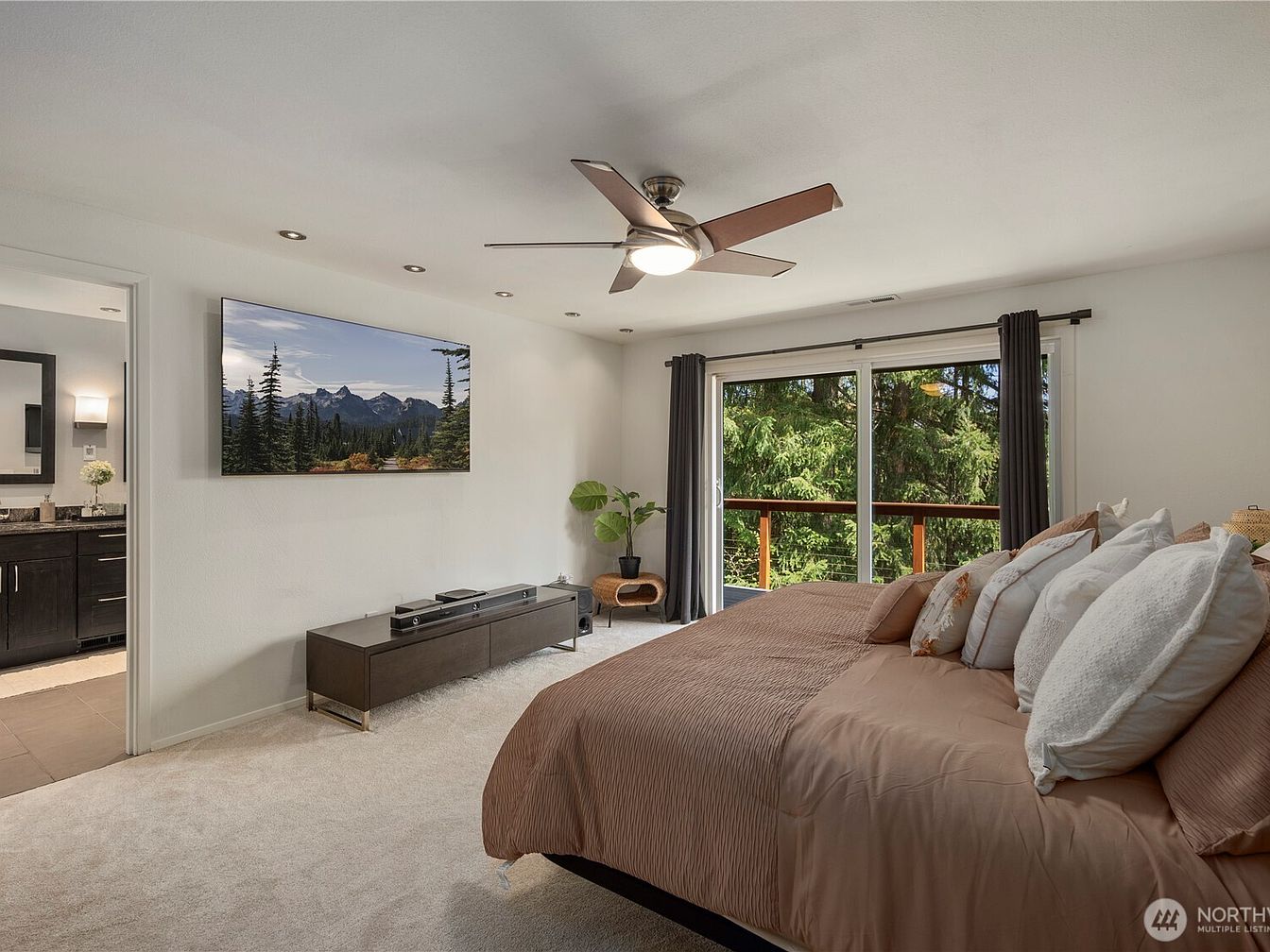 This spacious master bedroom is designed for comfort and relaxation, highlighted by a large bed adorned with soft beige and cream pillows and linens. A ceiling fan with wooden blades and a central light fixture provides both airflow and illumination. The sliding glass doors allow abundant natural light while offering scenic views of lush greenery outside, complemented by simple dark curtains. The neutral color palette of soft whites and warm tans contrasts with the sleek dark wood media console positioned under a wall-mounted flat-screen TV. An adjacent bathroom with dark cabinetry is partially visible, enhancing convenience and style in this serene retreat.