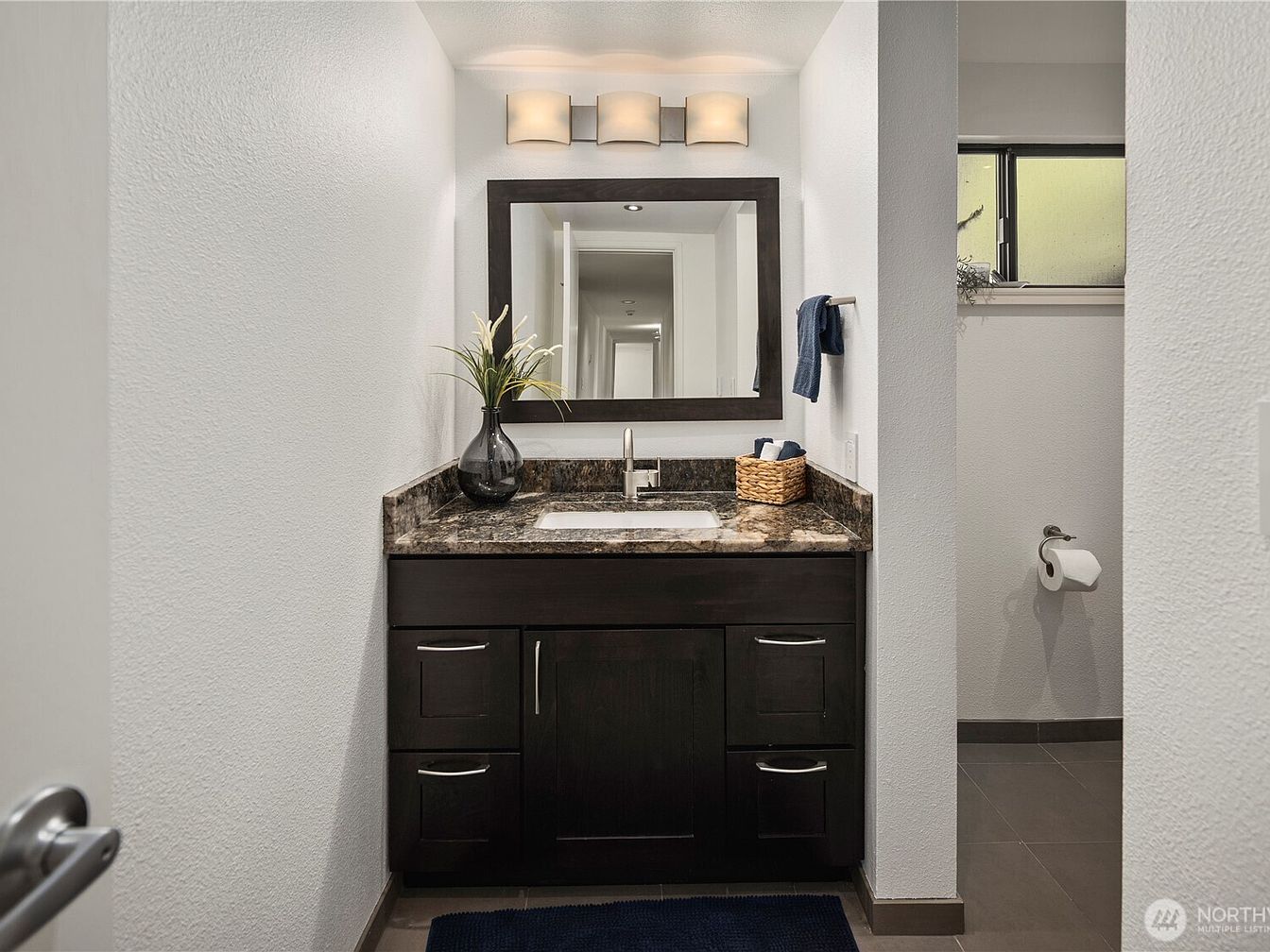 The space features a compact bathroom vanity with a sleek, dark wood cabinet base and a polished granite countertop that adds a touch of natural luxury. A rectangular undermount sink is centered beneath a large, dark-framed mirror, which visually expands the space and reflects ambient light from the contemporary three-light fixture above. The walls are painted a clean, crisp white, enhancing brightness and contrast against the deep tones of the cabinetry and countertop. Accents include a simple black vase with greenery and a neatly arranged wicker basket with towels, while a navy blue hand towel and matching rug add subtle color. The adjacent toilet area is visible through an open layout, separated by a partial wall and featuring a small window that brings in natural light, while the overall design emphasizes functionality with a modern, minimalistic aesthetic.