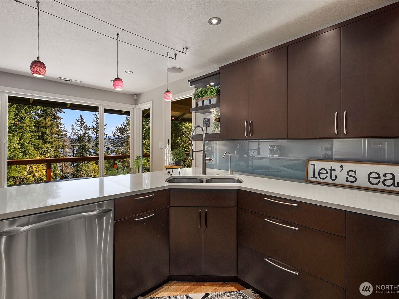 This kitchen features a sleek and modern design with deep espresso cabinetry contrasted by a bright white quartz countertop. The L-shaped layout includes ample storage with both upper and lower cabinets, complemented by stainless steel appliances including a dishwasher. A high-arc spring coil faucet centers the sink area, enhancing functionality. Above, three pendant lights with red and white swirled glass shades add a pop of color and artistic flair. Large sliding glass doors offer an expansive view of lush greenery and a distant water body, creating a seamless indoor-outdoor connection and a serene cooking atmosphere.