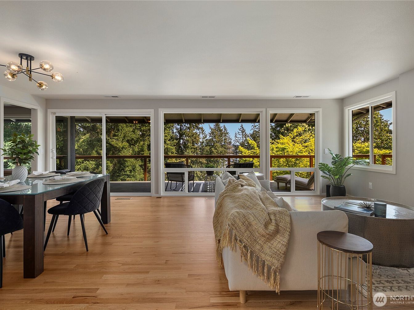 This spacious living and dining area blends natural light and nature views through expansive sliding glass doors and large windows that open onto a deck. The room features warm honey-toned hardwood floors that contrast softly with light gray walls and white trim. A modern black dining table with quilted black chairs sits adjacent to the living space, which offers a neutral-colored sofa adorned with a beige knitted throw. Minimalist, modern accents, including a geometric side table, a hammered metal coffee table, and a contemporary light fixture, add subtle sophistication. Greenery in a tall planter enriches the airy ambiance.