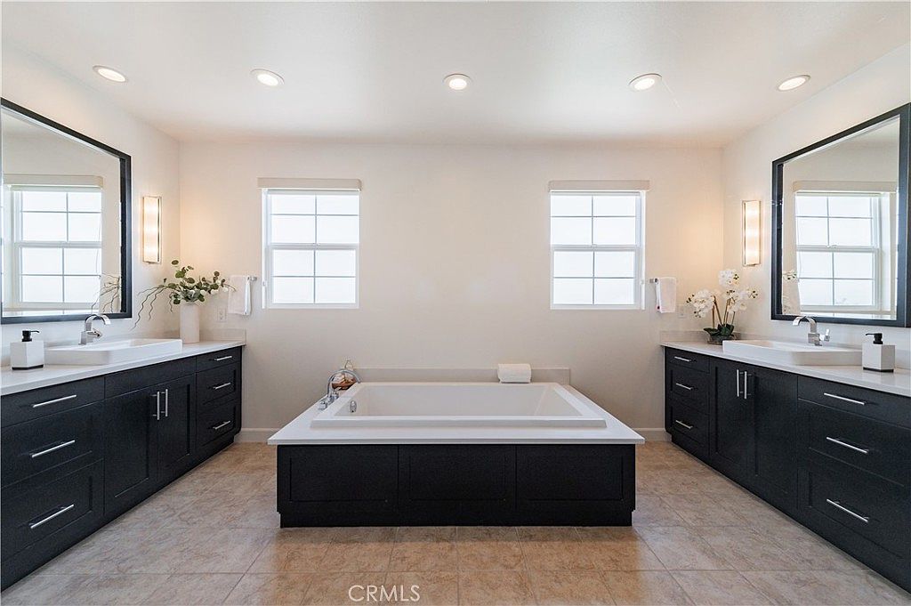 This spacious master bathroom features a symmetrical layout with two long black vanity cabinets facing each other, each topped with a white countertop and rectangular vessel sinks. Large black-framed mirrors hang above the vanities, flanked by sleek vertical wall sconces that provide soft illumination. Positioned centrally between two large windows, a sunken rectangular bathtub creates a focal point, framed by the same black cabinetry style. The walls are painted a crisp white, complementing the neutral-toned tile flooring. Minimal décor accents, such as potted plants and simple soap dispensers, enhance the modern, clean aesthetic of the space.
