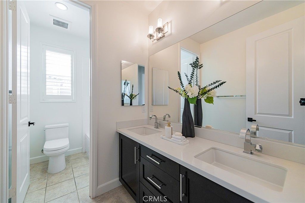 This bathroom presents a modern, clean design featuring a double vanity with sleek, dark cabinetry topped by a smooth white quartz countertop. Each rectangular basin has a contemporary chrome faucet, emphasizing minimalism. Above the vanity, a large mirror stretches the length of the counter, enhancing the space’s brightness and openness. Simple, chrome-accented wall lighting fixtures provide soft illumination. Adjacent to the vanity, a separate room houses the toilet, illuminated naturally by a window fitted with white plantation shutters. Neutral taupe and beige floor tiles complement the soft white walls, creating a calm and inviting atmosphere. Fresh floral arrangements add a touch of elegance and natural beauty.