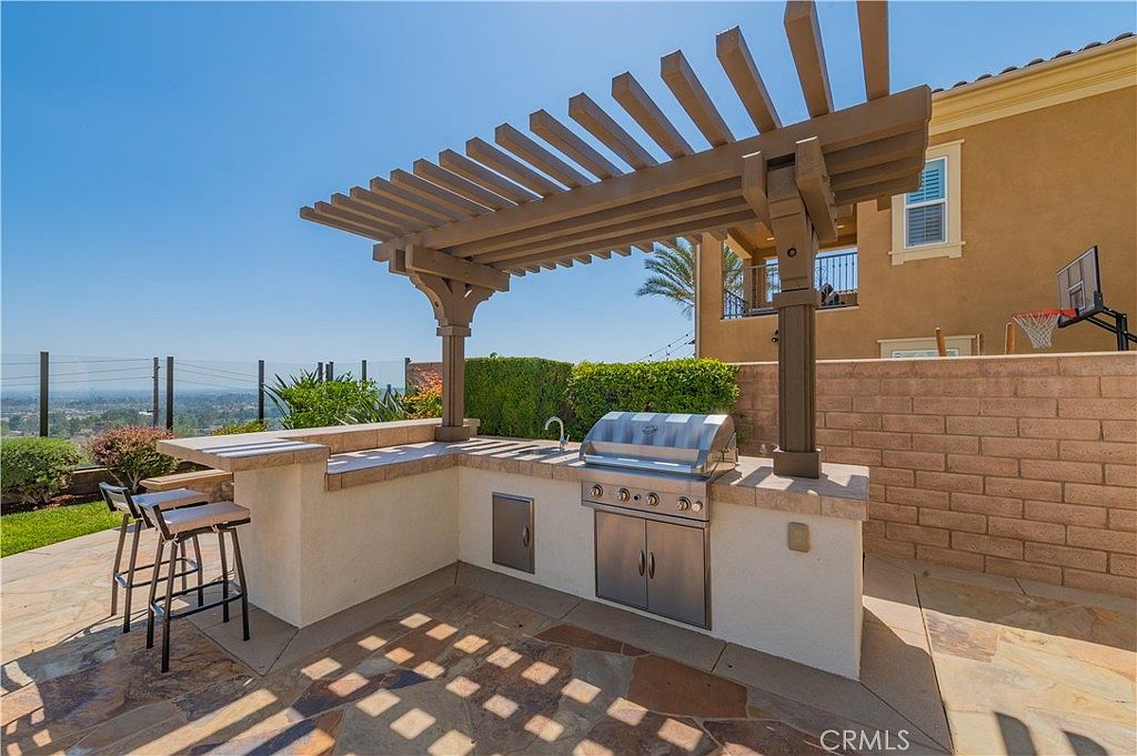This inviting outdoor kitchen area features a sleek built-in stainless steel grill set within a white stucco countertop and base. Above, a dark wood pergola provides partial shade, casting geometric shadows on the natural stone tiled floor. The space includes a wrap-around breakfast bar with beige stone trim and two modern bar stools providing seating for casual dining. The area is framed by a low brick privacy wall and lush greenery, offering a perfect blend of functionality and relaxation. The backdrop reveals a clear blue sky and expansive views, emphasizing an open, airy atmosphere ideal for entertaining.