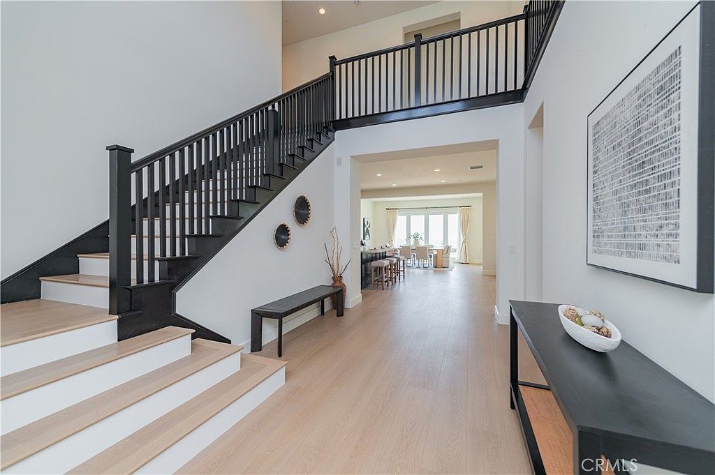 This entryway opens into a spacious, light-filled corridor with pale wood flooring that extends throughout the visible areas. The standout feature is a striking black staircase with simple vertical balusters and a matching handrail, creating a bold contrast against the neutral walls. Below the stairs, a minimalist black bench offers functional seating, complemented by two round decorative wall mirrors and a tall vase with dried branches to add subtle organic texture. Ahead, the passage flows seamlessly into a dining and living area, framed by a wide doorway, enhancing the open and airy atmosphere. On the right, a slim black console table holds a decorative bowl, while a monochromatic abstract artwork hangs above, underscoring the home’s modern, understated elegance.