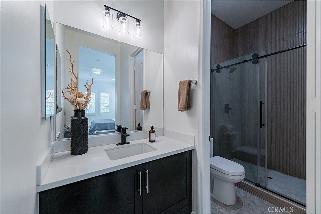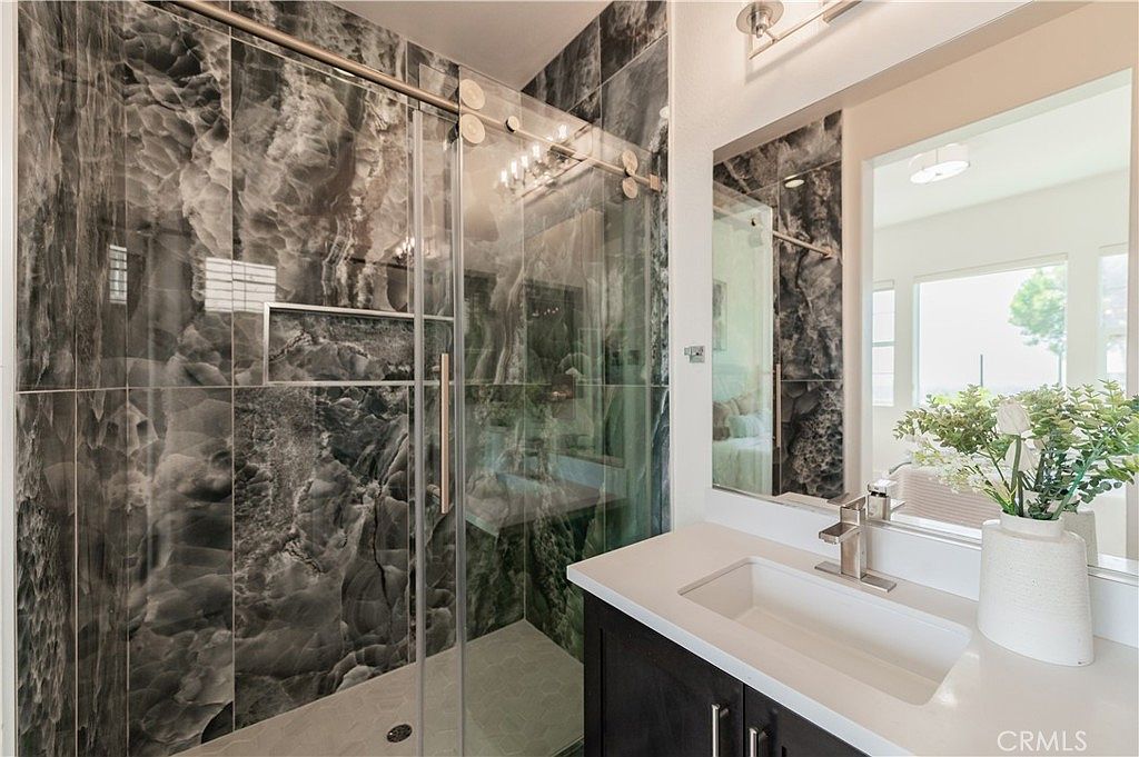 This bathroom section features a modern shower on the left with striking dark marble-like tiles in shades of black, gray, and white, adding dramatic texture and depth to the space. The shower is enclosed by clear glass sliding doors with sleek metallic hardware, enhancing openness. To the right, a contemporary vanity boasts a smooth, white countertop with an undermount sink and brushed metal faucet. Above the vanity, a large mirror reflects natural light coming from a window in the adjacent room. A simple white vase with fresh greenery adds a touch of natural elegance against the neutral tones and clean lines of the vanity cabinetry.