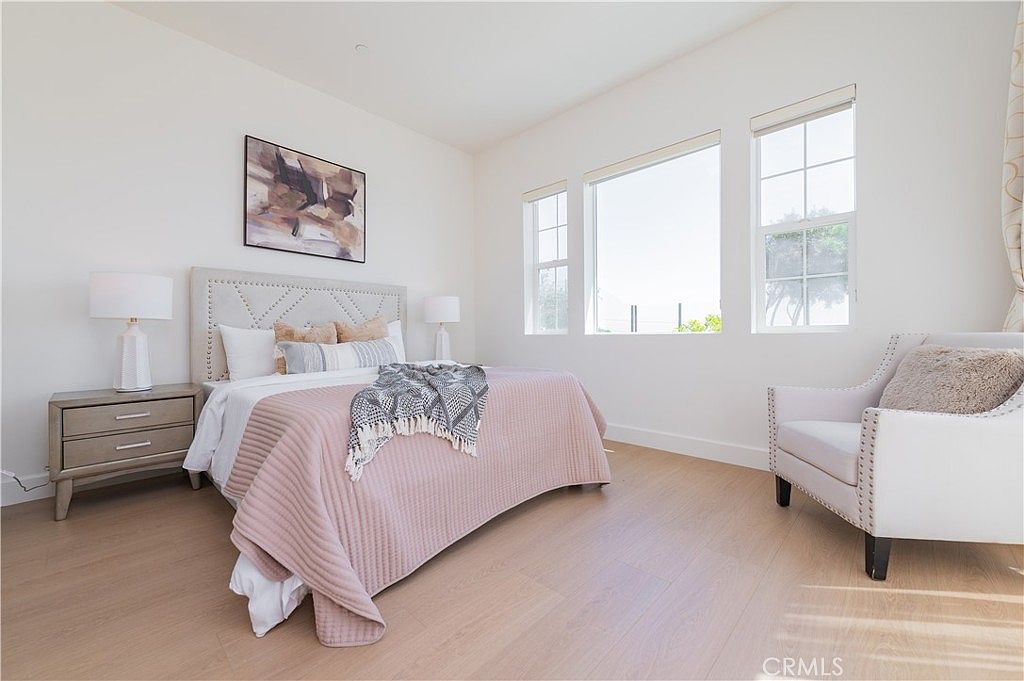 This bright bedroom features a calming palette of soft neutrals, centered around a plush bed draped in a muted mauve quilt paired with white and beige pillows. The headboard, adorned with studded trim, adds subtle textural interest. Two matching nightstands hold minimalist, white-shaded lamps, balancing symmetry and light. Three large windows flood the space with natural light, enhancing the room’s airy feel and highlighting the light wood flooring. A cozy armchair upholstered in white fabric with nailhead trim sits near the window, accompanied by a soft, tan throw pillow, creating an inviting corner perfect for relaxation and reading.