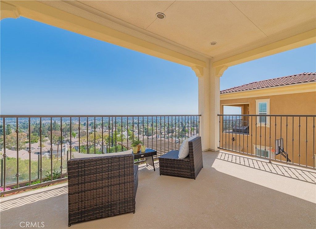 This spacious covered balcony offers a serene outdoor retreat with sweeping panoramic views of the neighborhood and distant horizon. The flooring is a smooth, light beige surface, complementing the soft cream tones of the structural columns and ceiling. Two dark woven rattan chairs with plush white cushions face outward, separated by a small matching side table adorned with minimalist décor. The balcony is framed by a sturdy black iron railing featuring vertical bars and decorative elements, enhancing safety without obstructing the scenic vista. The overall style blends comfort with subtle elegance, inviting relaxation and quiet contemplation.