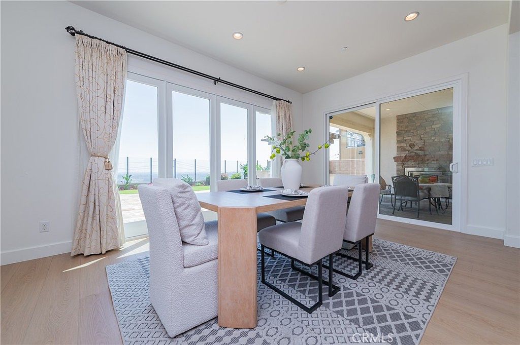 This serene dining area features a spacious light wood table surrounded by six upholstered chairs in soft grey, combining comfort and style. The pale, patterned area rug anchors the set, adding subtle texture and pattern to the pale hardwood floor. Large sliding glass doors and floor-to-ceiling windows fill the space with natural light and offer seamless views of an outdoor patio and distant landscape. Sheer, patterned curtains introduce a gentle warm tone, while the white walls, recessed lighting, and minimal decor create an airy, modern ambiance that balances practicality with elegance.