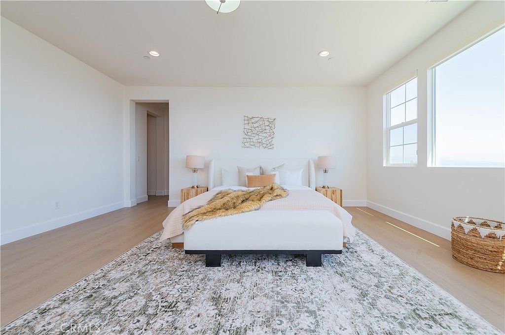 This master bedroom showcases a spacious, serene layout emphasizing daylight and simplicity. Soft white walls and ceiling amplify natural light streaming through two prominent windows, creating an airy ambiance. The light wood flooring harmonizes with the neutral color palette, enhancing warmth and calm. A low-profile white bed with an upholstered headboard anchors the center, adorned with cozy pillows, a textured throw, and a faux fur accent. Matching wooden nightstands feature modern lamps. A large, subtly patterned area rug provides texture beneath the bed, while a woven basket in the corner adds an organic, rustic touch to the minimalist, inviting space.