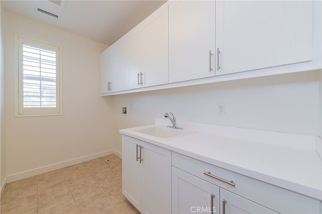 This laundry room features a clean and minimalist design with a bright white color palette that enhances the sense of space and cleanliness. The room is fitted with upper and lower cabinets offering ample storage, all with sleek, modern silver hardware. The countertop includes a built-in sink with a chrome faucet, ideal for handwashing and utility purposes. Natural light filters through a small window with plantation shutters, adding a warm, inviting feel. The floor is covered with beige tile, blending softly with the neutral wall paint to create a practical yet aesthetically pleasing workspace.