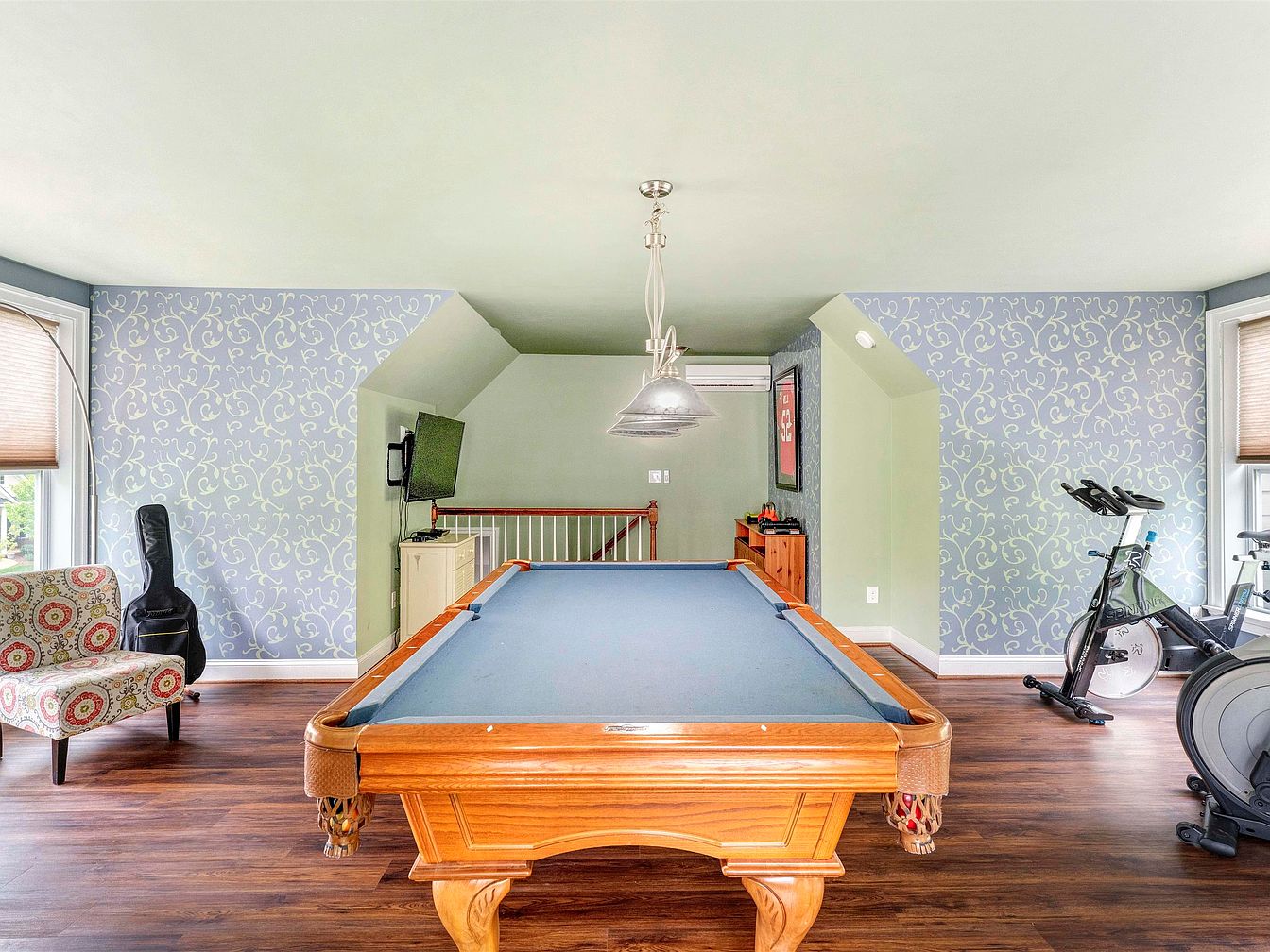 This spacious recreation room features a central wooden pool table with a rich blue felt top, offering a classic gaming focal point. The room is accented by calming pastel green walls with patterned wallpaper on the side alcoves, enhancing its cozy, inviting atmosphere. Natural light filters through two large windows with neutral blinds, illuminating the warm-toned wood flooring. To one side, a stylish upholstered chair with a multicolored pattern and a guitar case create a relaxed nook, while the opposite side houses modern exercise equipment, balancing leisure with fitness. A wall-mounted TV and minimalist cabinetry add functionality, blending entertainment and comfort seamlessly.
