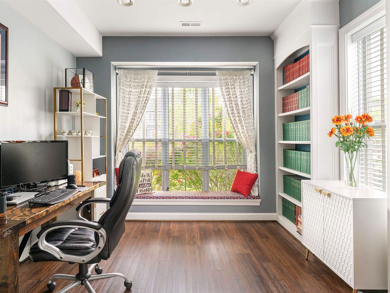 This home office features a cozy and bright layout centered around a large bay window with soft white blinds and sheer patterned curtains. A built-in window seat with a floral cushion and vibrant red pillows invites relaxation while overlooking the garden outside. The walls are painted in a calm gray tone, complementing the rich dark wood flooring. A rustic wooden desk paired with a black ergonomic chair creates a functional workspace. On one side, a tall shelving unit holds decor and books, while on the other, built-in white cabinetry and bookshelves filled with green and red volumes add character and storage. A vase of bright orange flowers brings a pop of warm color to the predominantly neutral, polished space.