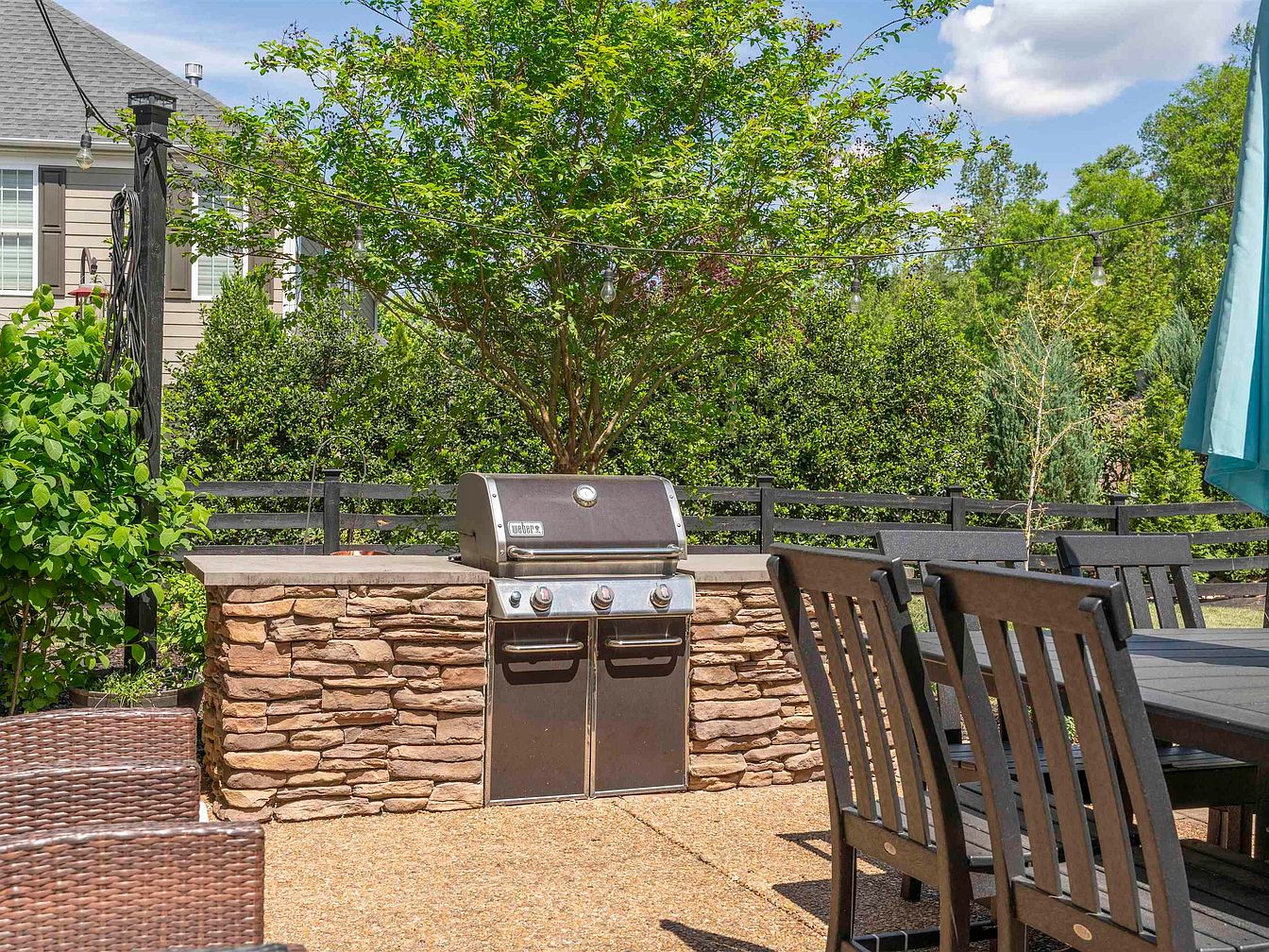 This outdoor space features a built-in stone grill station with a stainless steel Weber gas grill, seamlessly integrated into a natural stacked stone facade. Adjacent to the grill is a spacious dark wood dining table surrounded by matching outdoor chairs, perfect for family gatherings or entertaining guests. The patio is paved with textured concrete, adding rustic warmth, complemented by lush greenery and mature trees that provide a refreshing backdrop. Overhead, string lights are draped, adding ambiance and inviting evening use. The space strikes a balance between functional outdoor cooking and comfortable, nature-inspired dining aesthetics.