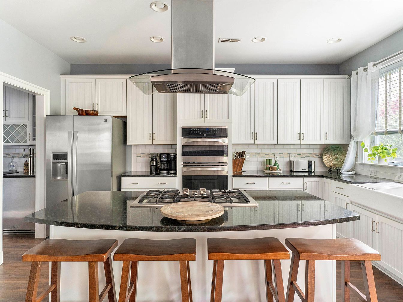 This kitchen features a spacious island with a polished black granite countertop, which serves as both a cooking and seating area with four wooden stools. A stainless steel gas cooktop is integrated into the island, accompanied by a modern curved glass range hood overhead. The cabinetry is white with vertical panel detailing, lending a farmhouse charm, while stainless steel appliances, including a double oven and a side-by-side refrigerator, blend seamlessly into the background. The walls are painted in a soft gray, highlighted by a subway tile backsplash with mosaic accents. Natural light filters through a wide window dressed in sheer white curtains, brightening the space and complementing the warm wood floors.