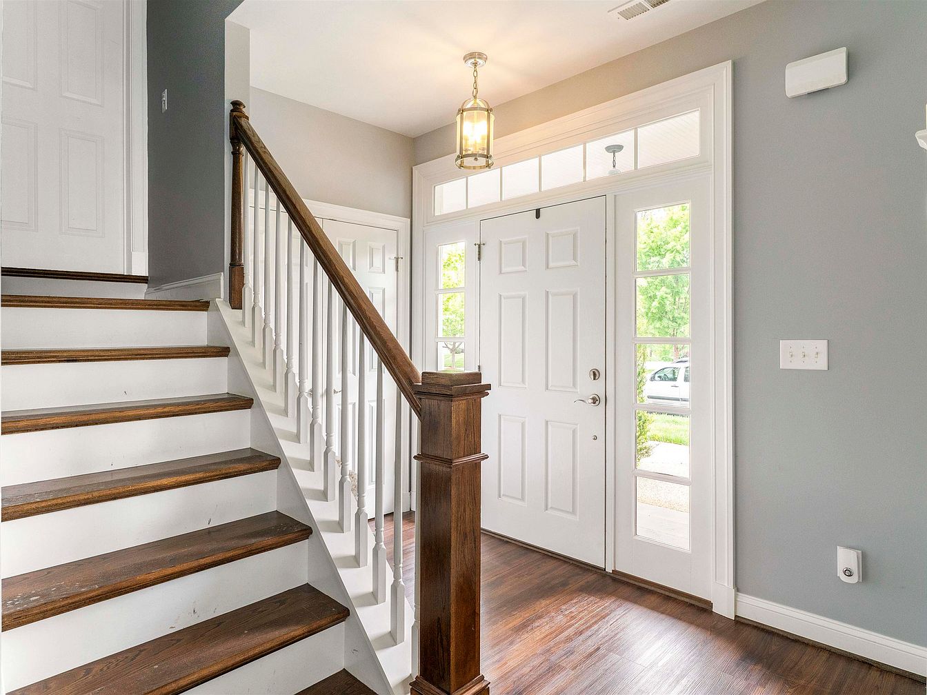 This welcoming entryway features a bright white front door with sidelights and a transom window, flooding the space with natural light. Soft gray walls create a calm backdrop that complements the rich, dark hardwood flooring. The staircase to the left showcases wooden steps with white risers and crisp white spindles, topped by a polished dark wood handrail and newel post, adding warmth and classic charm. A brass pendant light fixture hangs overhead, enhancing the inviting ambiance while blending traditional and modern elements in a seamless design.