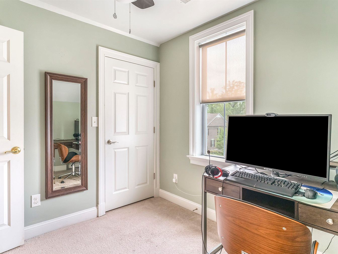 This home office corner exudes a calm and functional atmosphere with its soft sage green walls and white trim, lending a fresh yet understated backdrop. A compact, dark wooden desk with metal legs anchors the space, holding a widescreen monitor, keyboard, mouse, and headset for a streamlined workstation. A modern mid-century inspired chair with a smooth wooden finish complements the desk, offering ergonomic comfort. Natural light filters through a white-framed window with a rolled-down beige shade. Opposite the desk, a tall rectangular mirror with a dark wooden frame hangs beside a white paneled door, enhancing the room’s openness and style. Soft, neutral carpeting underfoot adds warmth and coziness to this efficient workspace.